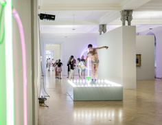 Wood, light bulbs, acrylic paint, and go-go dancer in silver lamé bathing suit, sneakers, and personal listening device